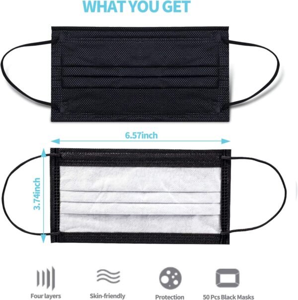 4. Features – The disposable black mask design prevents the diffusion of various air particles and water droplets. It can protect and completely block the nose and mouth from liquid splashes