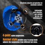 Safety and Comfort: This safety helmet features a 4-point ratchet suspension system with padding to ensure comfort and is adjustable. The suspension system reduces pressure points while enhancing stability, making it suitable for all-day wear.