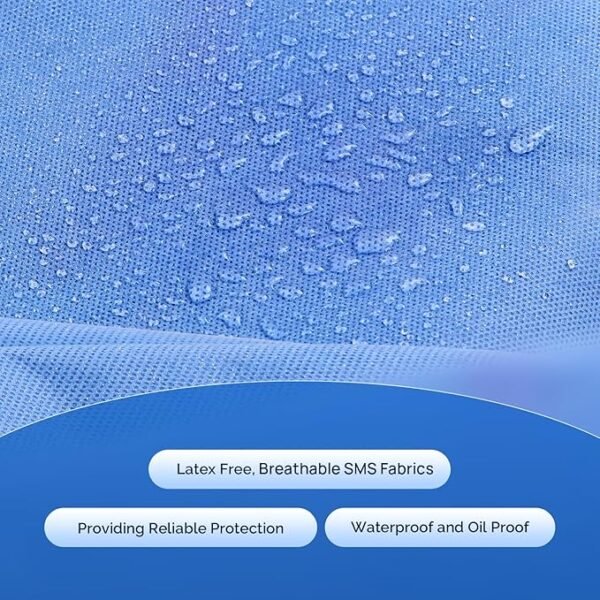 The SMS material consists of two layers of spunbond non-woven fabric (S) sandwiched by one layer of meltblown non-woven fabric (M), which is waterproof, has high strength, tear resistance, good filtering performance, and comfortable breathability. The material is 100% polypropylene.