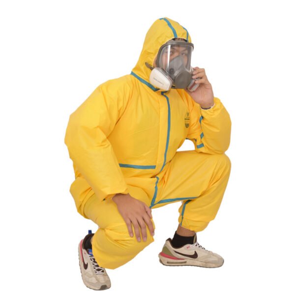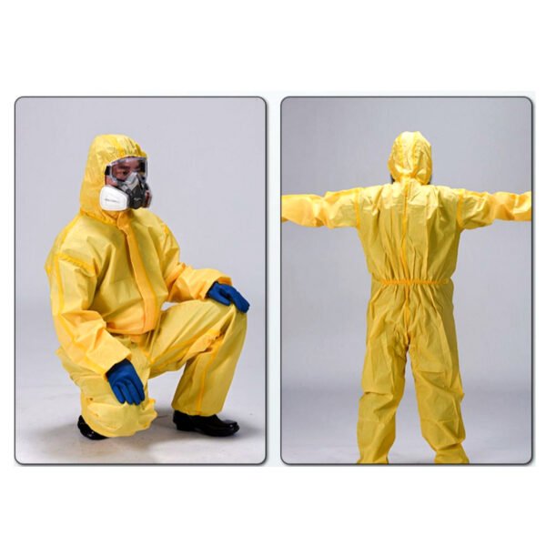 The chemical protective suit has a lotus leaf waterproof function. The principle is also known as the “self-cleaning” effect. When it gets wet, water droplets will automatically form. Just use a clean cotton cloth to quickly absorb the moisture and it can be cleaned thoroughly.